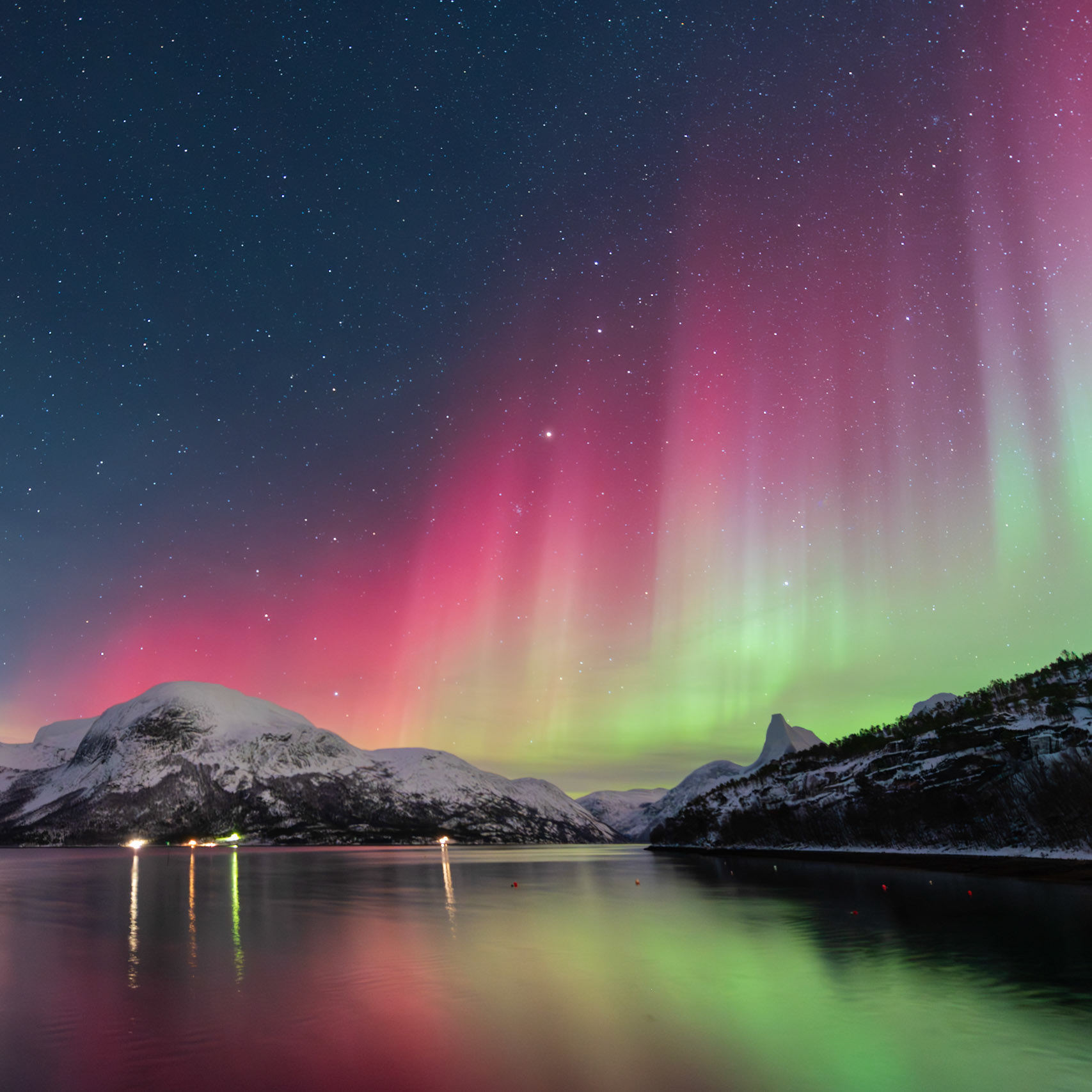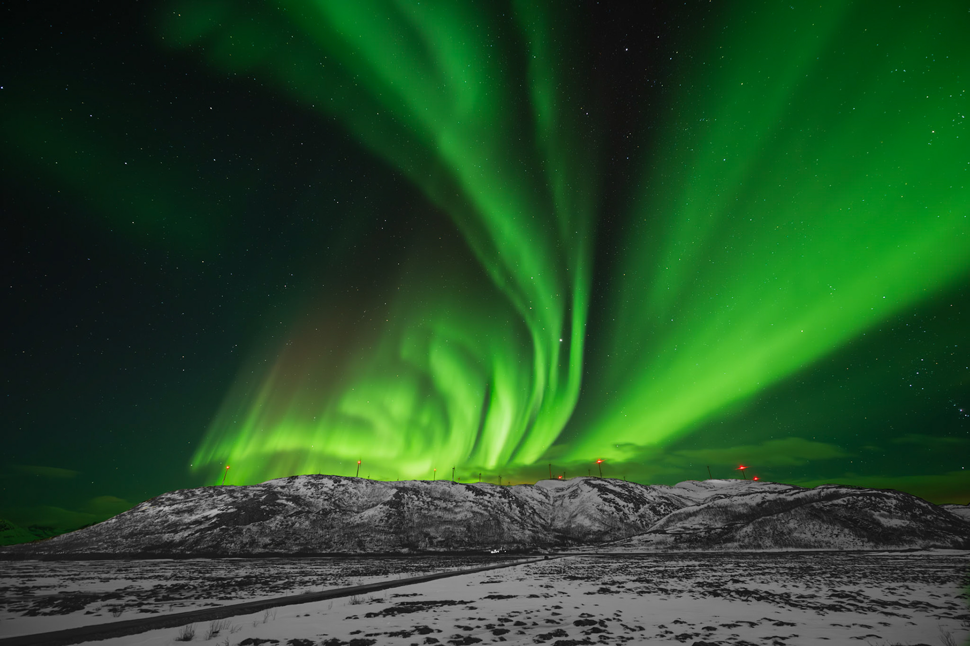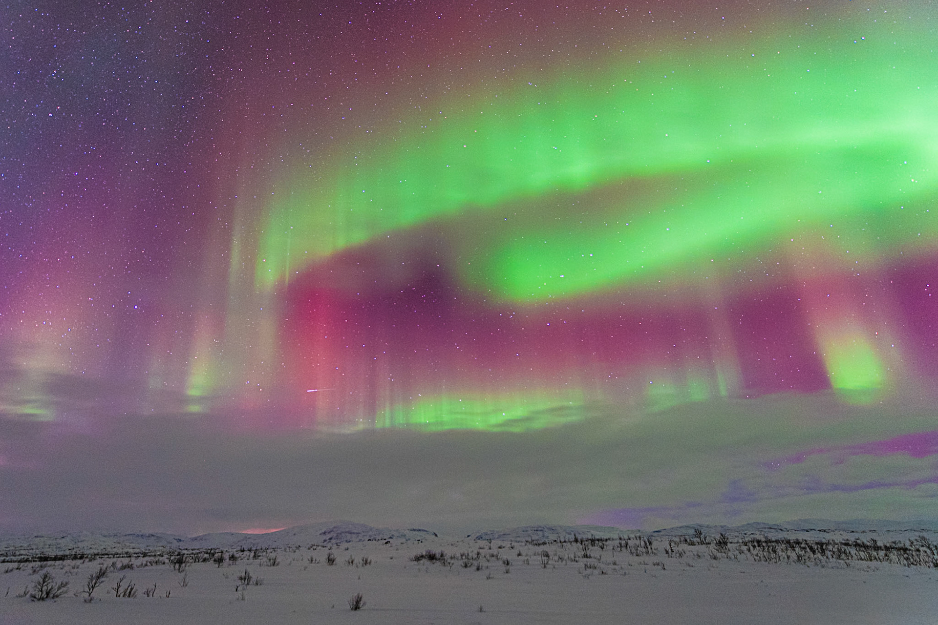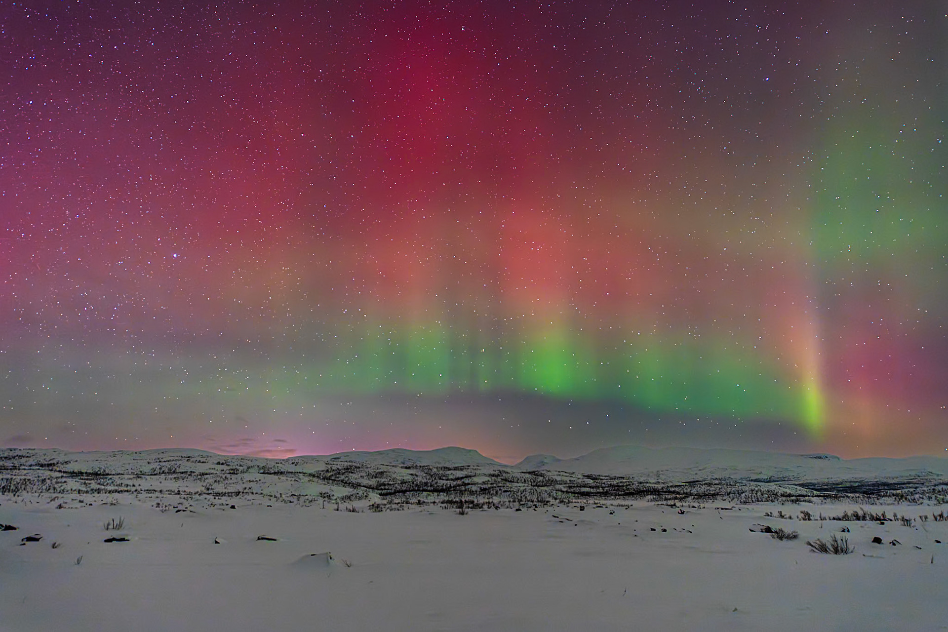 Während des Maximums des solaren Aktivitätszyklus der Sonne, kann der Solarwind so stark sein, dass die Nordlichter die schneebedeckten Berge fast taghell erscheinen lassen. Dann hat man auch gute Chancen, das rote Polarlicht der oberen Atmosphäre zu beobachten.