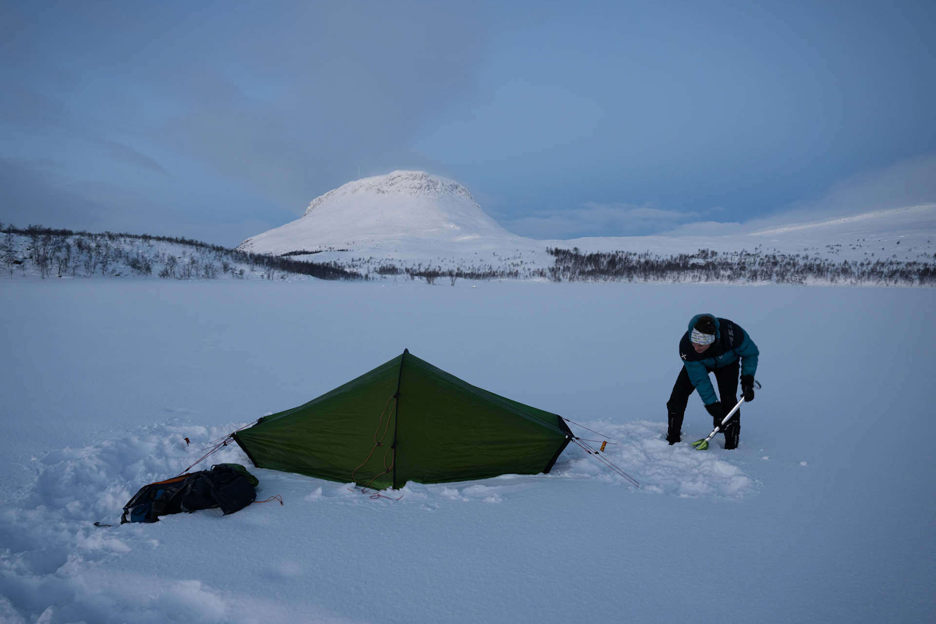 Der Berg Saana ist der heilige Berg der Samen. Mit dem Zelt steigen wir zur Hochebene auf, um in der Nacht die Nordlichter zu fotografieren. Das Zelt steht auf einem zugefrorenen See, und leider ist der Schnee auf Grund der Kälte so pulverig, dass die Schneeanker nicht halten. Keine gute Voraussetzung für eine ruhige Nacht.
