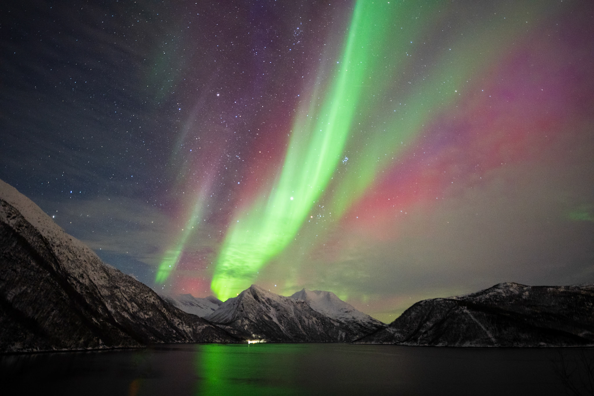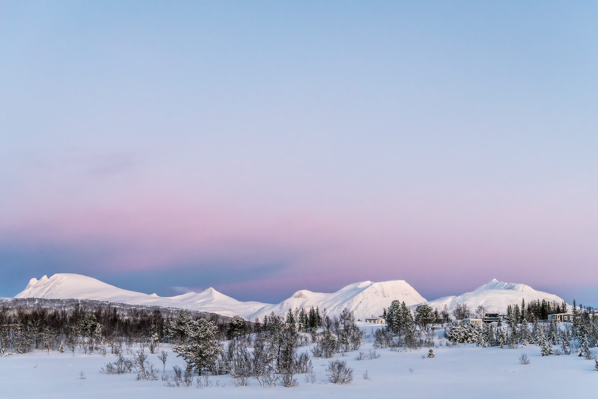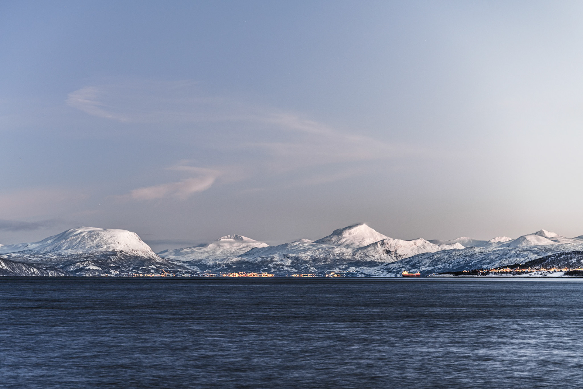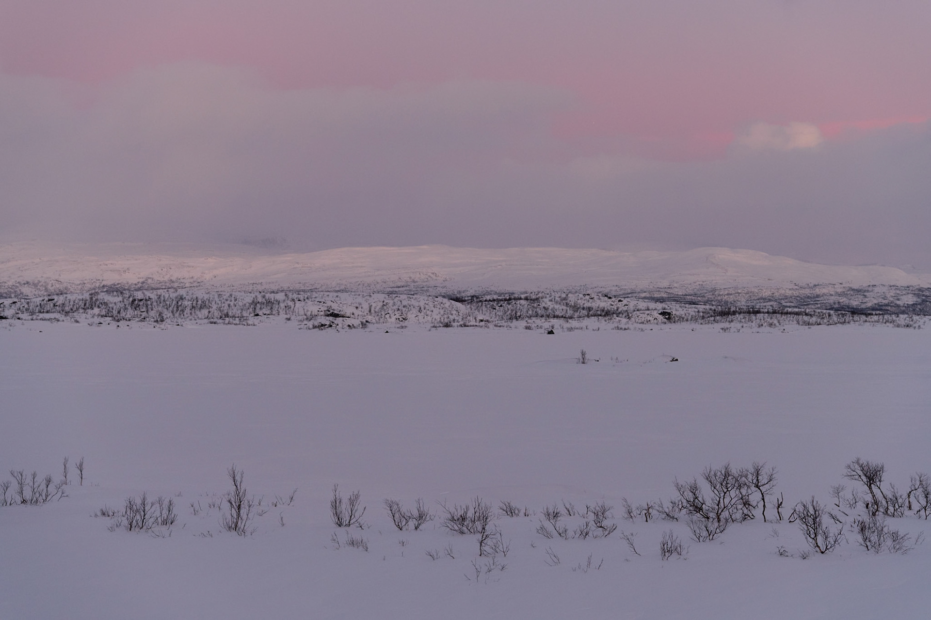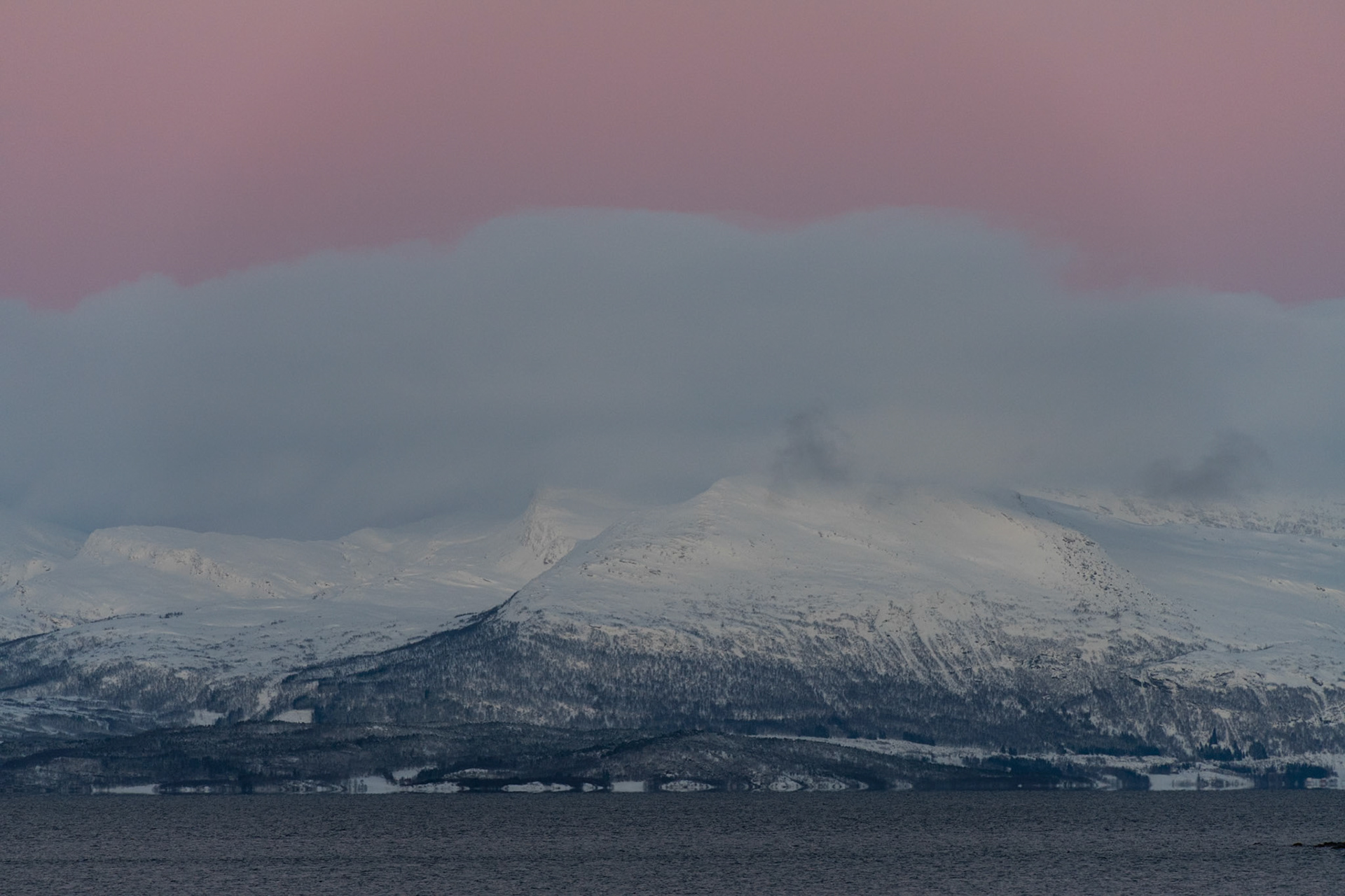 Für die kurze Zeit des Tages, in der die Berge und Fjorde nicht in Dunkelheit gehüllt sind, erscheint die Natur in einem unglaublich weichem zart-rosa Licht.