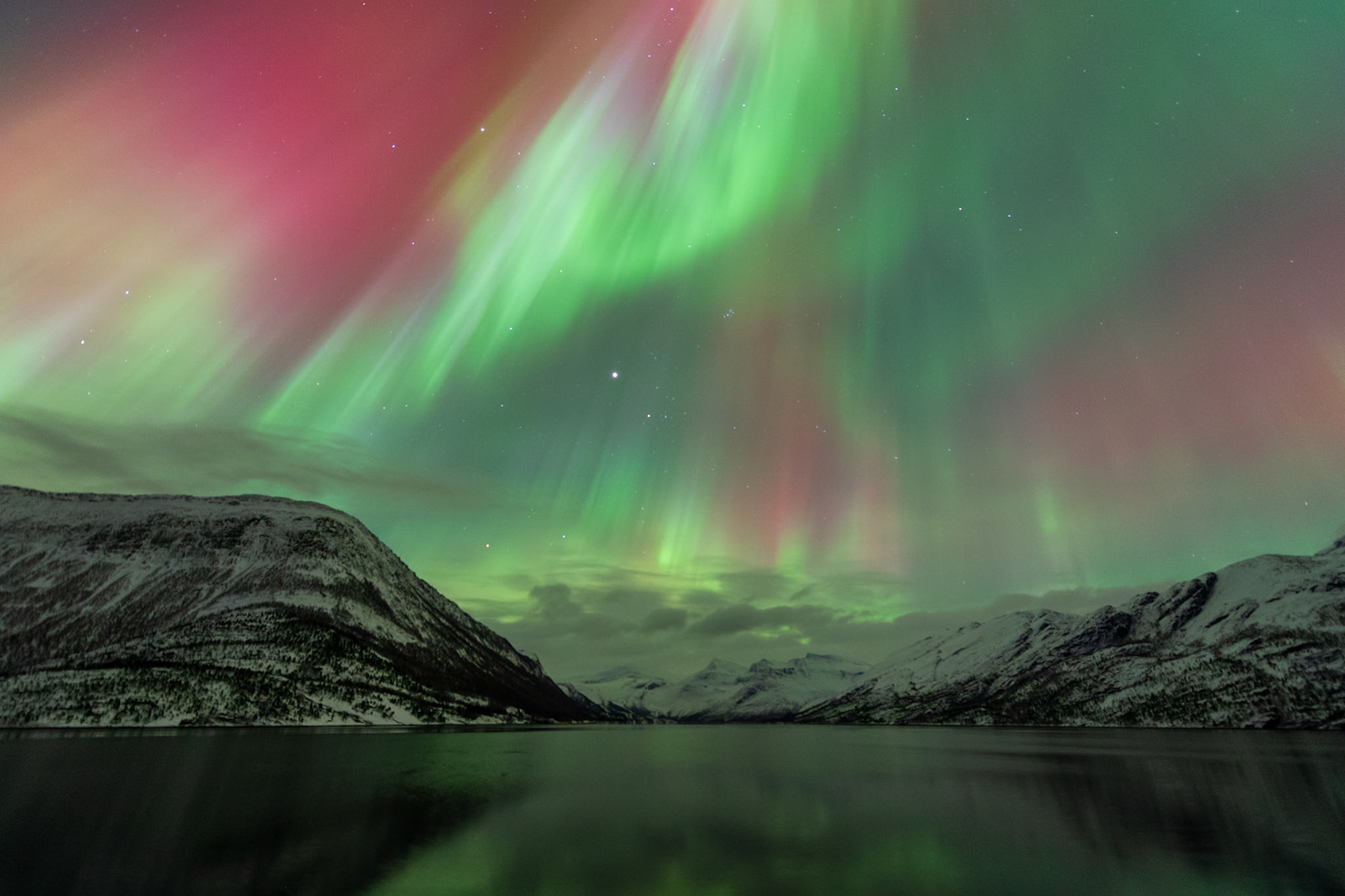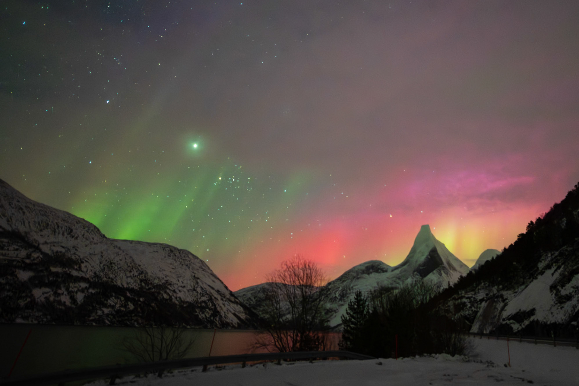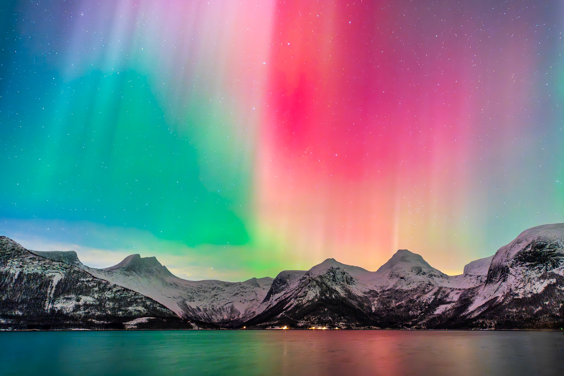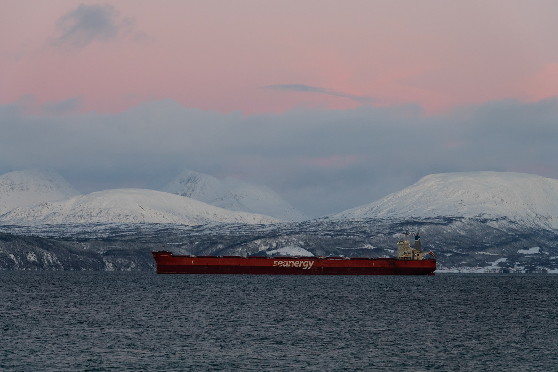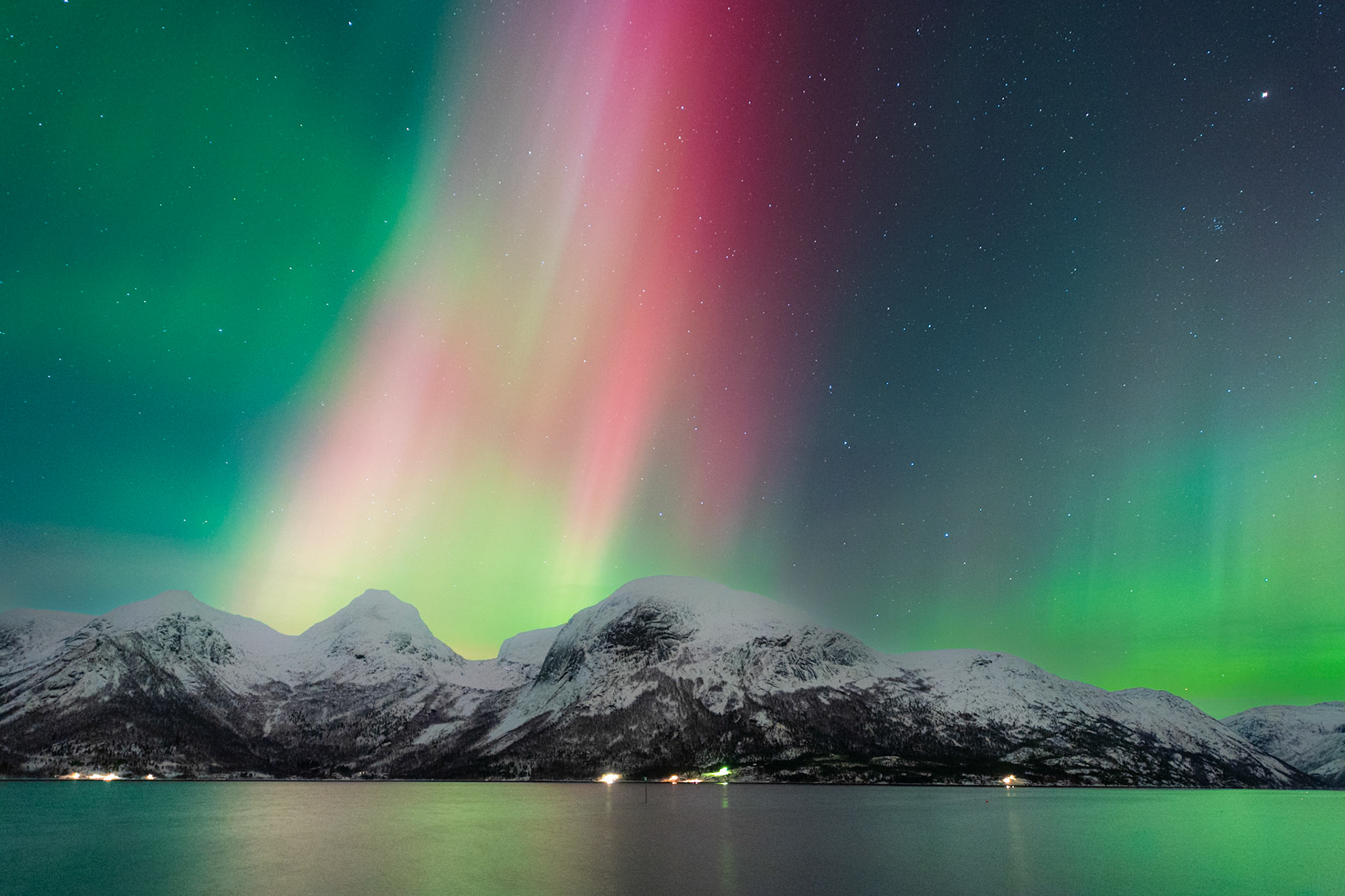 Für die kurze Zeit des Tages, in der die Berge und Fjorde nicht in Dunkelheit gehüllt sind, erscheint die Natur in einem unglaublich weichem zart-rosa Licht.