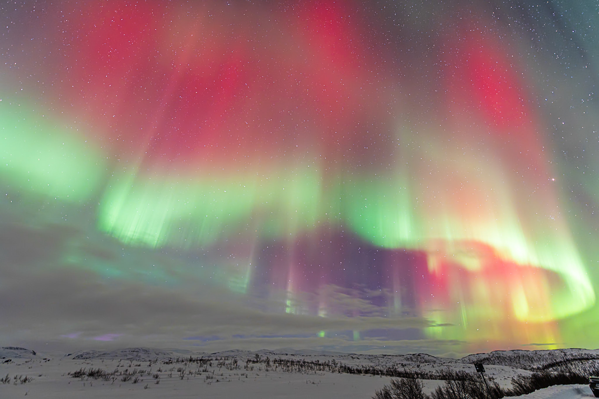Am Silvesterabend geht es nach Abisko jenseits der schwedischen Grenze. Bekanntermassen ist es dort oft weniger bewölkt als an der Küste. Höhepunkt der Nordlichtaktivität. Der ganze Himmel leuchtet.