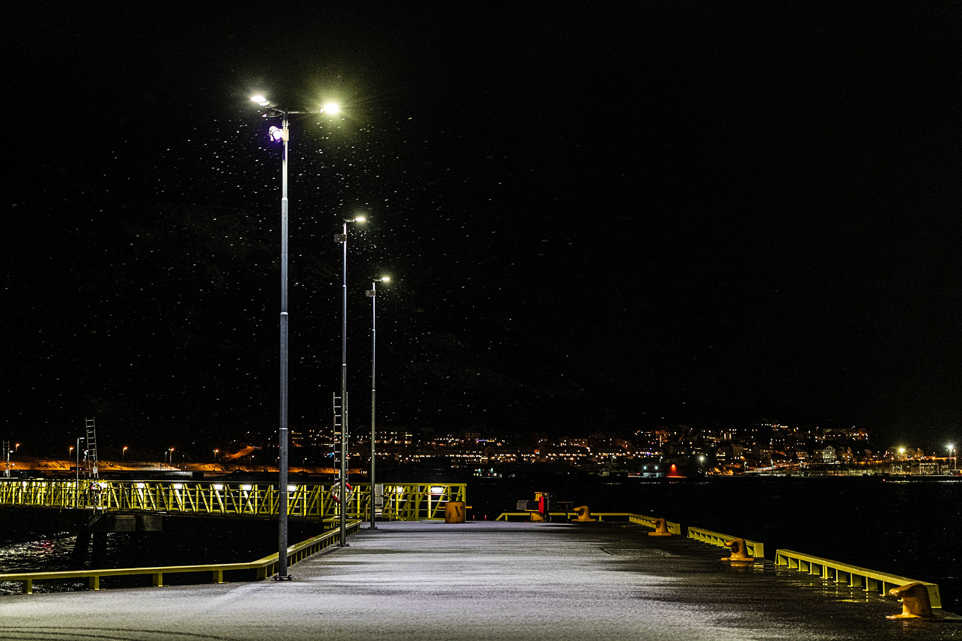 Nachmittags um 4 Uhr in Narvik. Ist ist stockdunkel. Der Hafen lädt zu einem Rundgang ein. Kaffee im Bahnhofsbistro.