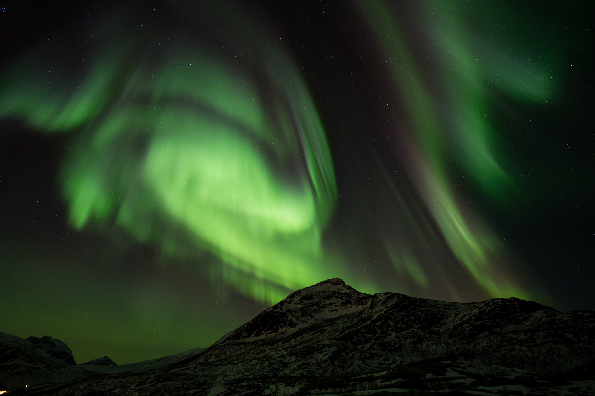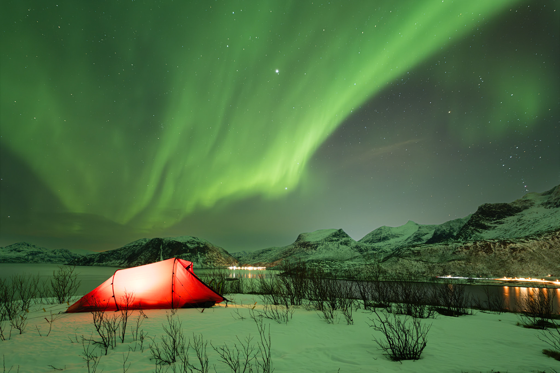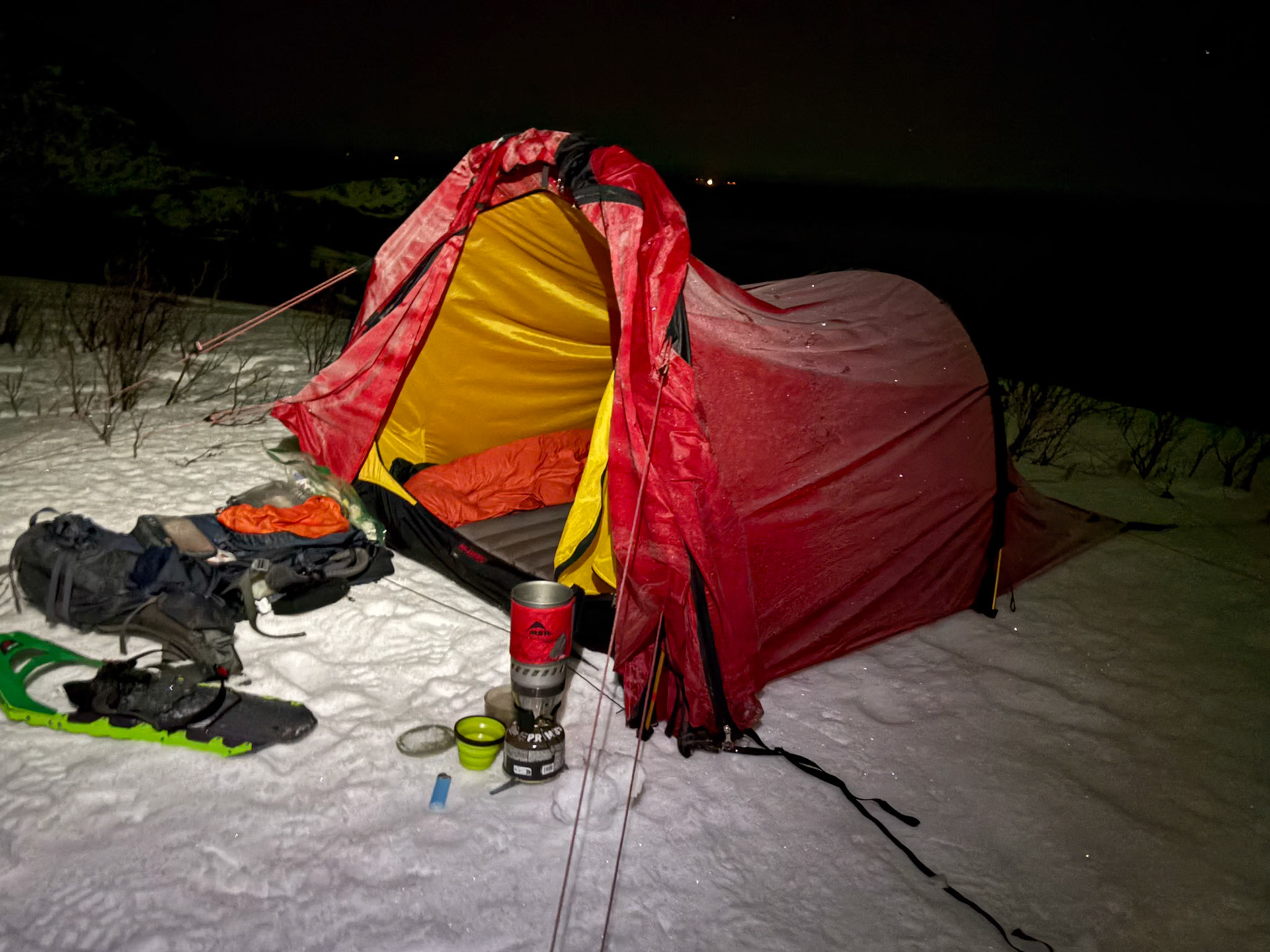 400km nördlich des Polarkreises. Reise ins Ungewisse. Ich wusste ein paar Tage vor Abreise nach Tromsö nur, dass das Wetter recht gut werden sollte und die Nordlichtaktivität war hoch. Aber wohin es genau gehen sollte - es würde sich ergeben. Ein Auto hatte ich am Flughafen trotzdem reserviert, falls ich mich doch entscheiden sollte, Richtung Finnland zu fahren. Zwei Rucksäcke hatte ich dabei: Einen mit meiner vollständigen Winterausrüstung incl. Zelt und Trockenfutter für ein paar Tage. Und einen Fotorucksack, der noch schwerer war. Zu Hause hatte ich auf Google Earth ein paar potentielle Spots fürs Zelten markiert. Also rein ins Abenteuer, allein das Satellitentelefon als Rettungsanker dabei, falls es ganz grob werden sollte...
