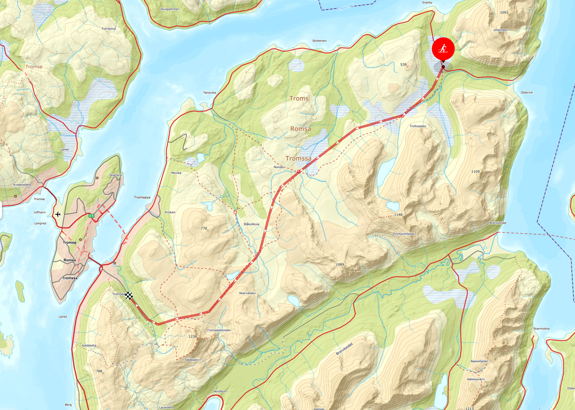 März 2026 // Der Frühling erreicht nun auch langsam den Norden von Skandinavien. Die Tage werden wieder länger, und erlauben einem auf komplexere Mehrtagestouren durch die Weiten des Landes zu gehen. Bevor der Schnee vollends weicht, entscheide ich mich spontan nachmals nach Tromsö zu fliegen und dort eine Tour mit dem Pulken von Snarbyeidet nach Tromsdalen zu machen. Das ist etwa eine Stunde von Tromsö entfernt. Wegen der Anreise mit dem Auto werde ich aber nicht bis Tromsdalen gehen, sondern in der Mitte umkehren und zurück zum Start wandern. Vier Tage habe ich eingeplant, alle Übernachtungen im Zelt obwohl es unbewartete Hütten mit Winterraum auf dem Weg gäbe. Die uneingeschränkte Freiheit und Flexibilität sind mir wichtiger.