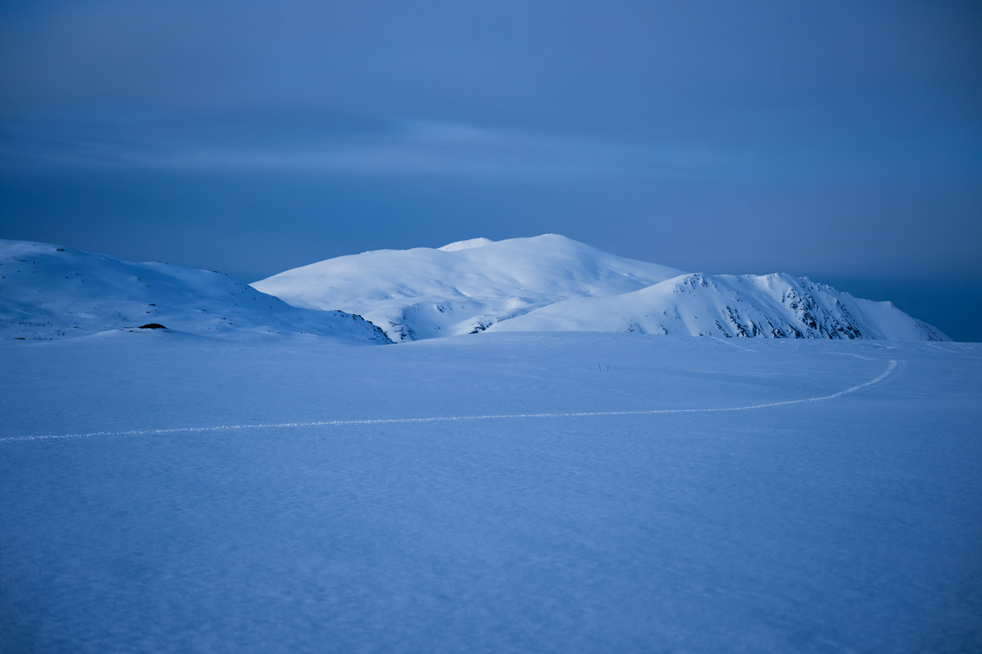 Blaue Stunde. Ob ich an diesem Tag die Sonne gesehen habe, weiss ich nicht mehr. Auf jeden Fall war sie nun unter dem Horizont verschwunden, und alles bereitete sich auf die lange Nacht vor. Die Wettervorhersage für morgen war schlecht. Regen oder Schnee, starke Winde und im schlimmsten Fall ein white-out. Zur Sicherheit hatte ich den Hinweg auf meinem Garmin-GPS aufgezeichnet. Trotzdem bin ich froh, zumindest im Abendlicht noch die Spur meiner Ski im Schnee zu sehen.