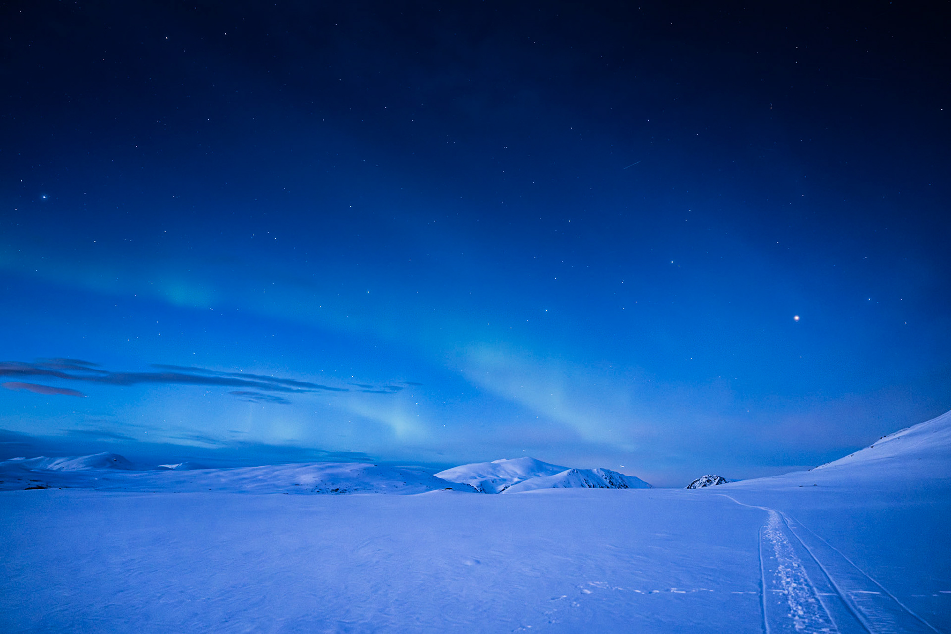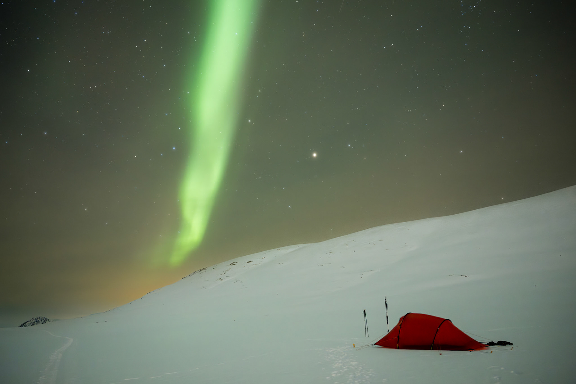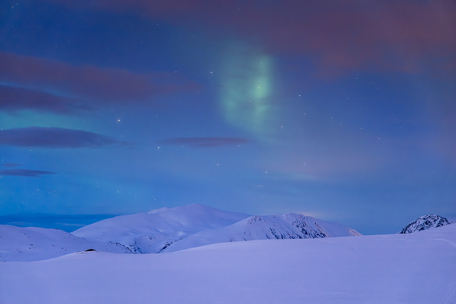 Am späteren Abend klart es unerwartet auf. Im März dauert die Dämmerung schon fast ewig. Erst gegen 22 Uhr wird es wirklich dunkel. Eine lange Zeit des Nichts-tuns, nachdem ich gegen 17 Uhr das Zelt aufgebaut hatte. Im Winter erscheinen die ersten Nordlichter schon am späten Nachmittag. Start gegen 17 Uhr kann hier durchaus realistisch sein. Diese Bilder unten sind in der Dämmerung gegen 20 Uhr entstanden. Der grüne Bogen des Nordlichts und ein paar andere Tupfer heben sich leicht vom Licht der blauen Stunde ab.